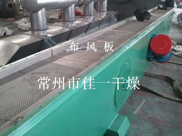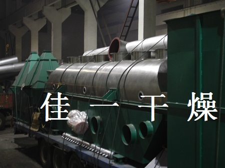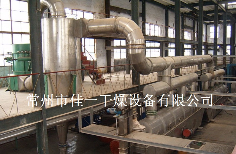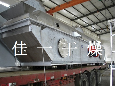 物料自進(jìn)料進(jìn)口進(jìn)入機(jī)內(nèi),在振動(dòng)力作用下,物料沿水平面流化床拋擲,向前連續(xù)運(yùn)動(dòng),熱風(fēng)向上穿過流化床同濕物料換熱后,濕空氣經(jīng)旋風(fēng)分離器除塵后由排風(fēng)1:3排出.干燥物料由排料進(jìn)口排出。