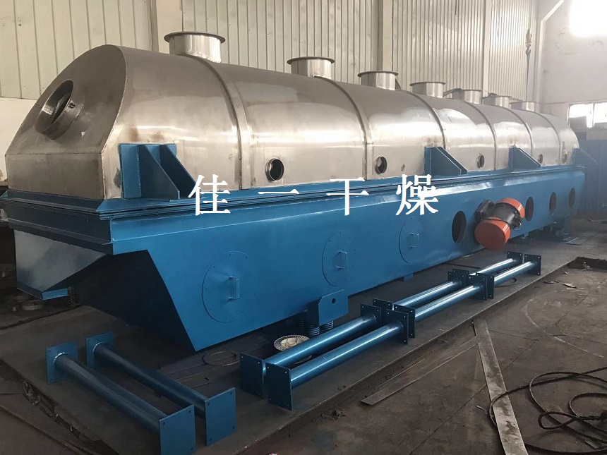振動流化床是連續設備,物料有一端加料口聯系加入被干燥物料,濕物料在床面上呈拋物狀往出料口端移動,熱空氣有床層布風板呈噴射狀與濕物料接觸完成熱交換,被干燥后的物料從另一端出料口聯系出料,濕空氣經上箱體排風管排出,根據不同物料除塵裝置可選配旋風分離器或布袋除塵器。