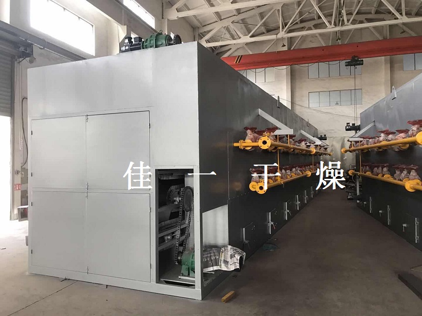 物料由加料器均勻地鋪在網帶上,網帶一般采用12-60目不銹鋼絲網,由傳動裝置拖動在干燥機內移動。干燥機由若干單元組成,每一單元熱風獨立循環,部分尾氣由專門排濕風機排出,廢氣由調節閥控制,熱氣由下往上或由上往下穿過鋪滿物料的多層網帶完成熱量與質量傳遞的進程,帶走物料水份。網帶緩慢移動,運行速度可根據物料溫度自由調節,干燥后的成品連續落入收料器中。上下循環單元根據用戶需要可靈活配備,單元數量亦可根據需要選取。